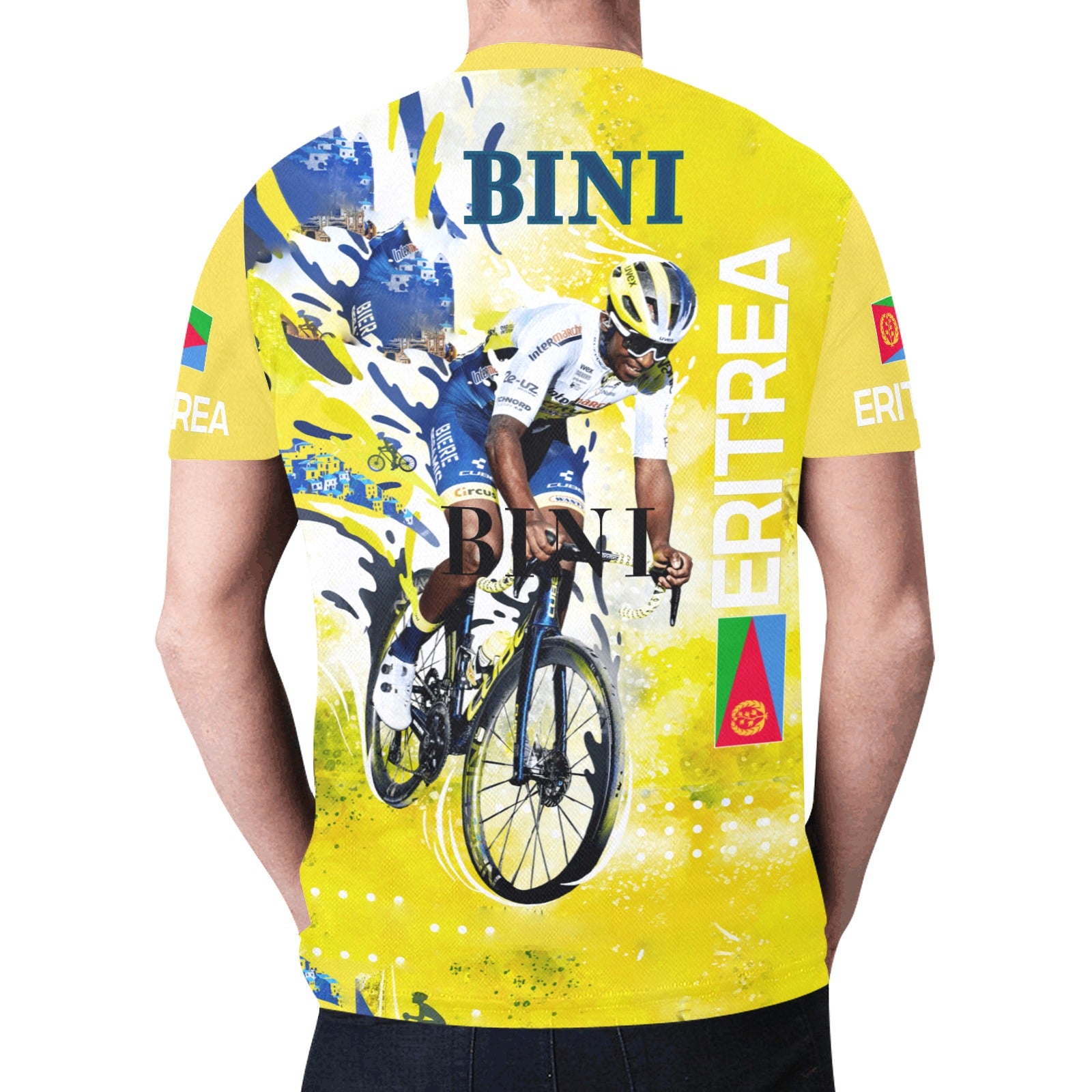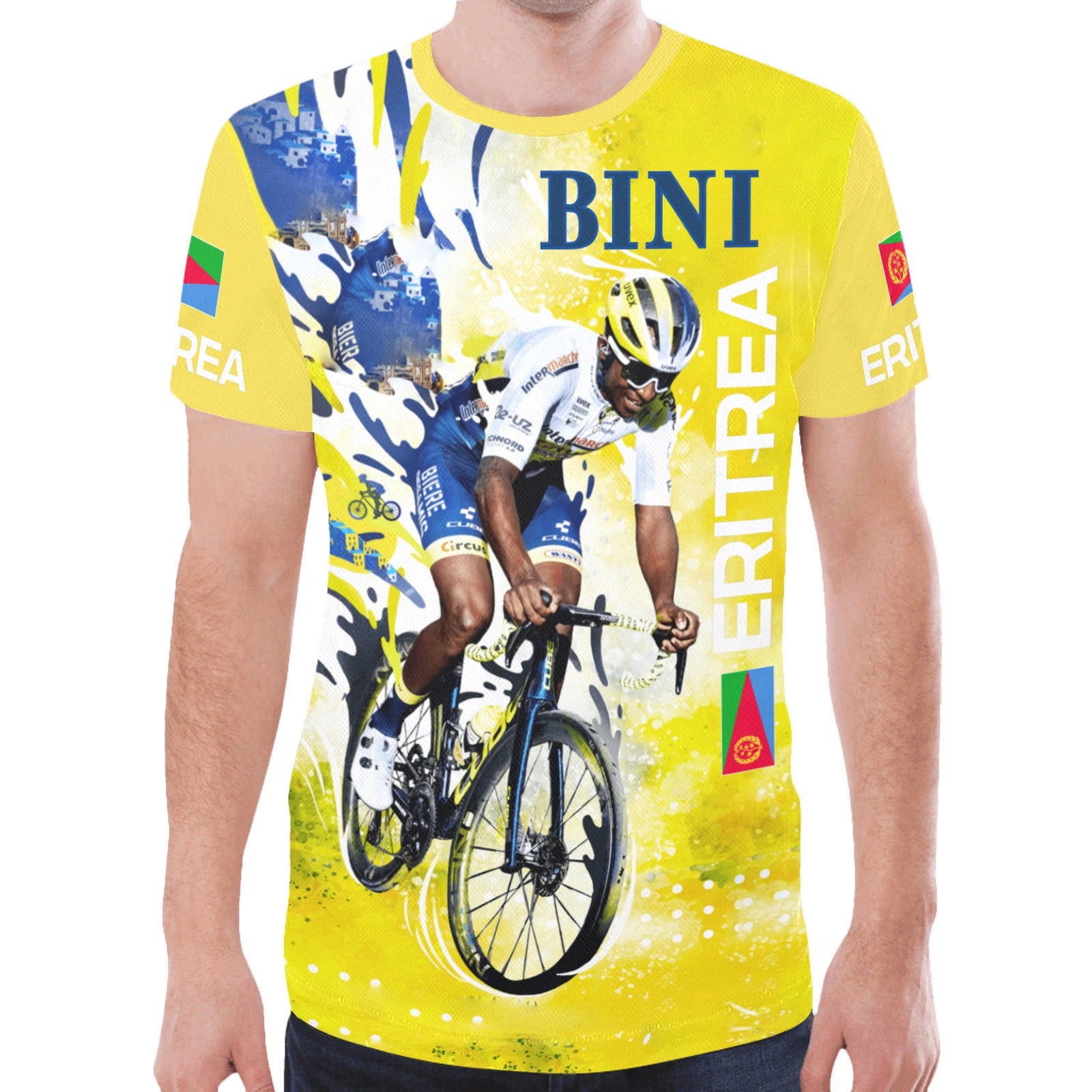 This Custom All-Over Print T-Shirt for men combines style and comfort, featuring a relaxed fit and high-quality sublimation printing. The shirt is designed with the iconic image of Biniam Ghirmay, the Eritrean cyclist, with the Team Intermarché logo, making it a perfect choice for fans and athletes alike. Made from 100% polyester mesh cloth, this t-shirt is breathable, soft, and durable.